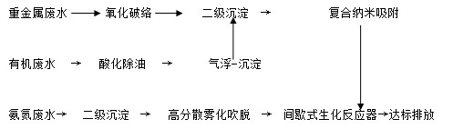 重金屬廢水氧化破絡破穩(wěn)后,由二級沉淀去除高濃度重金屬,再由復合納米吸附把關重金屬達到相關排放標準;有機廢水經酸化除油后,通過氣浮沉淀一體化技術去除微溶性有機污染物,大幅度降低有機污染負荷,最后經二級沉淀進入重金屬廢水處理系統(tǒng);氨氮廢水先二級沉淀去除高濃度重金屬,然后通過高分散霧化吹脫技術大幅度削減廢水中氨氮含量,最終經CBMS-MACA間歇式生化反應,出水穩(wěn)定滿足《電鍍污染物排放標準(GB21900—2008)》太湖電鍍行業(yè)最低排放限值(表3標準)。